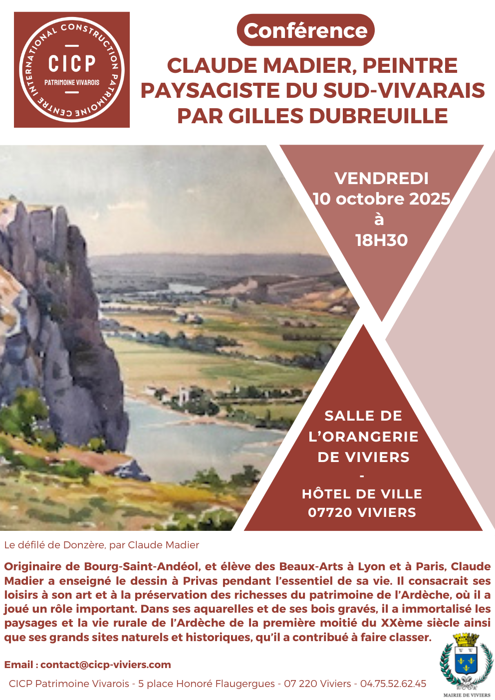 Une conférence sur le peintre et graveur ardéchois Claude Madier (1883-1944) aura lieu à l’Orangerie de la Mairie de Viviers le vendredi 10 octobre 2025 à 18 h 30.