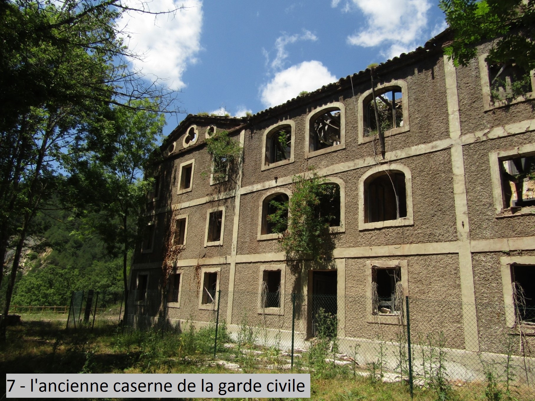 – Plus haut, à droite en montant vers la carrière (A), la caserne de la Guàrdia Civil (V) construite pour abriter un détachement de soldats assurant le maintien de l’ordre et la protection du dépôt d’explosifs nécessaires à l’exploitation.