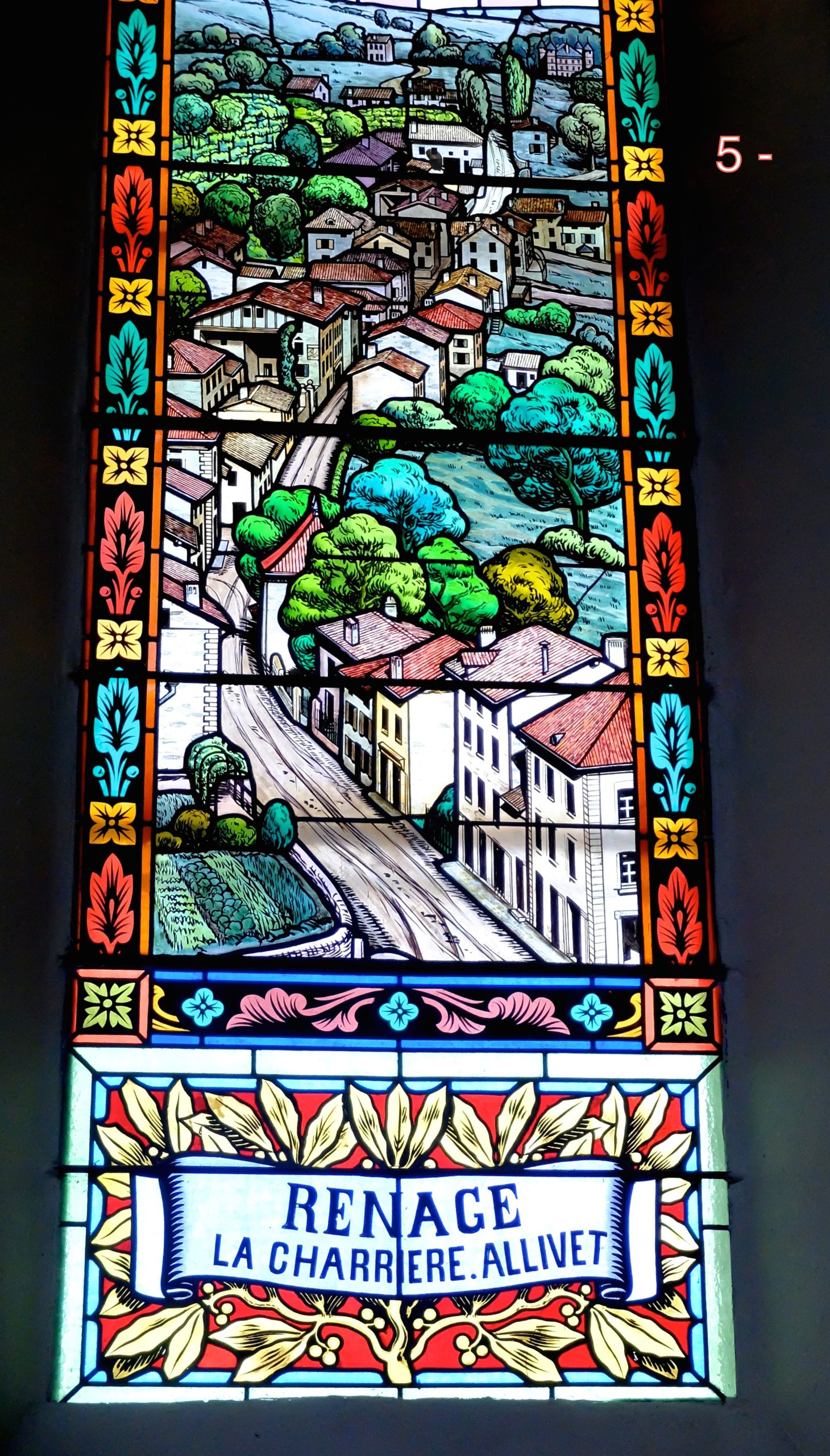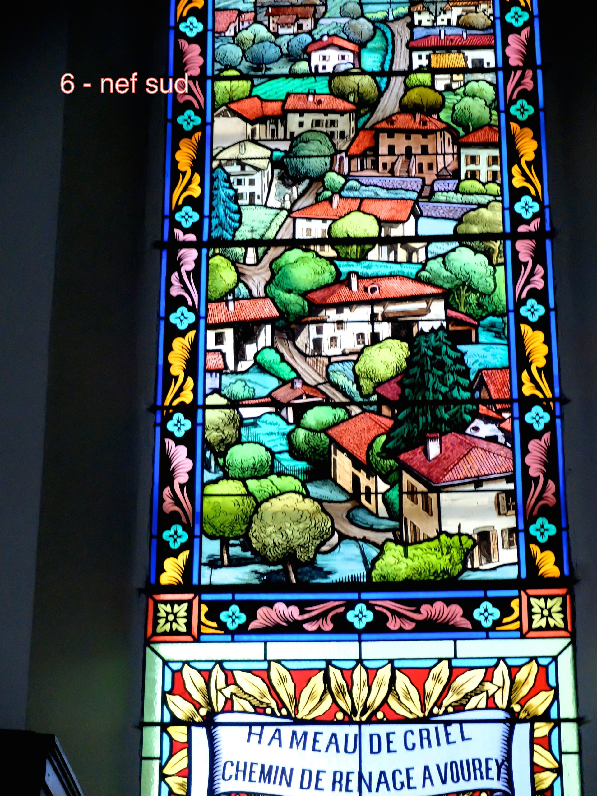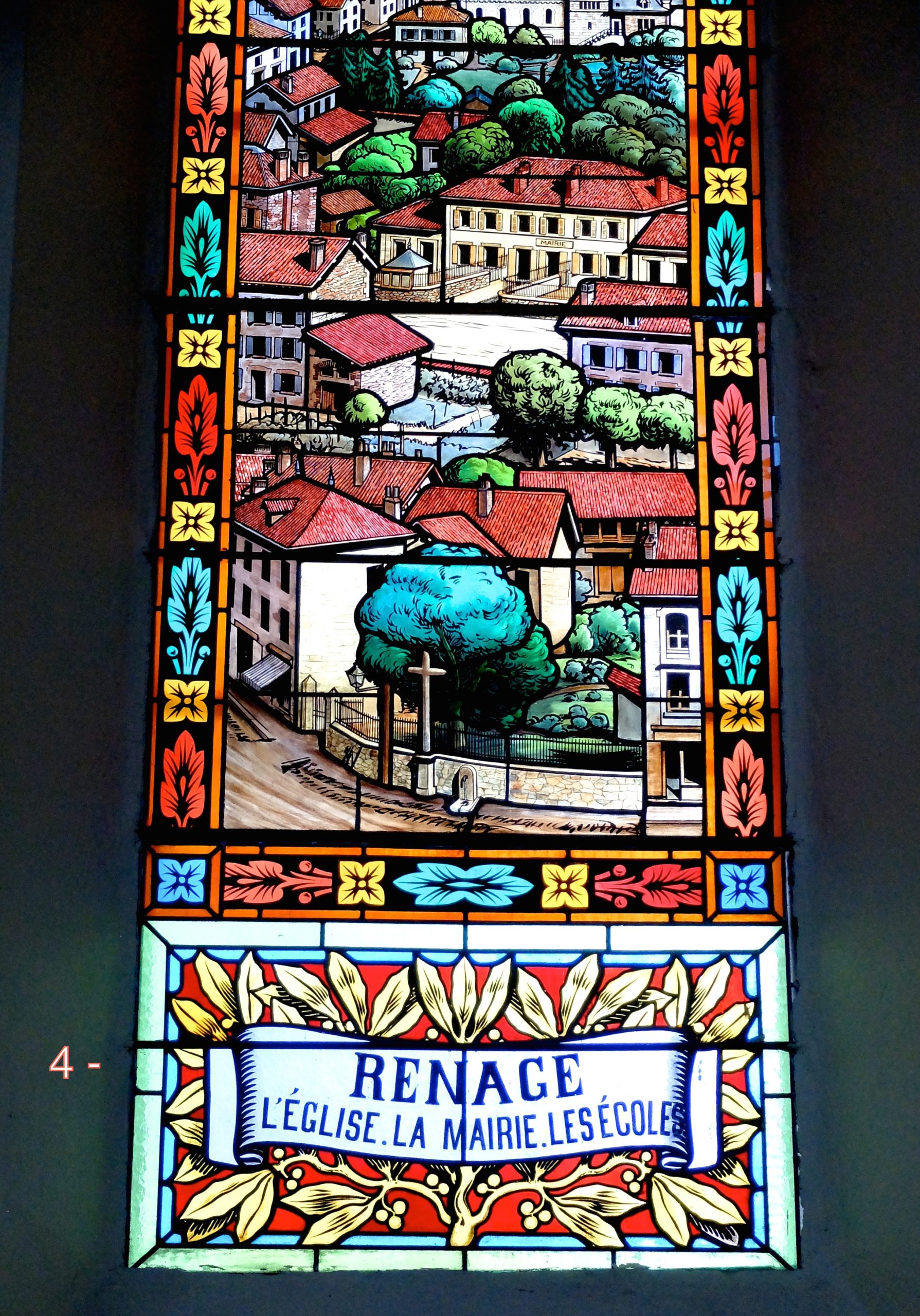 Renage, un village du Dauphiné. On passe devant l’église, elle est ouverte, on entre. Une église néo-médiévale comme il y en a tant d’autres en Dauphiné. Mais ce qui surprend c’est le programme des vitraux. D’abord dans la nef de droite : rien de religieux, chaque vitrail est consacré à un hameau ou un quartier de la commune : maisons, église, place, usines… Les vitraux de l’abside sont consacrés à des saints de sexe masculin. Ceux de la façade ouest, sous la rosace, sont des saintes dont le seul point commun est d’être des femmes (deux reines : saintes Fernande (je n’ai rien trouvé sur elle !) et Mathilde (née vers 896 et morte en 968, elle fut l’épouse d’Henri l’Oiseleur, roi de Germanie et la mère d’Otton Ier, fondateur du Saint-Empire romain germanique), aussi ste Claire, ste Hélène, ste Lucie, ste Elisabeth). Au bout du collatéral gauche, s. Bruno, ce qui n’est pas étonnant si près de la Chartreuse. Mais au bout de l’autre collatéral c’est un saint Pierre avec une épée plantée dans le dos : il s’agit de saint Pierre de Vérone, un dominicain, né à Vérone en 1205, inquisiteur assassiné par ceux qui avaient à craindre de lui en 1252 d’un coup de serpe ou d’épée. Représentation exceptionnelle chez nous : quel intérêt poussait les habitants de Renage ou tout simplement leur curé, à mettre en valeur ce saint qui n’est plus célébré aujourd’hui que dans son ordre ? Quel intérêt local pour ces deux reines que l’on ne célèbre guère ? Dans la nef de gauche, une diversité de saints : des femmes (ste Thérèse d’Avila), un apôtre et le cardinal s. Charles Borromée, peut être parce qu’il fut un artisan de la Contre-réforme et on est dans un pays bien gagné par le protestantisme ?