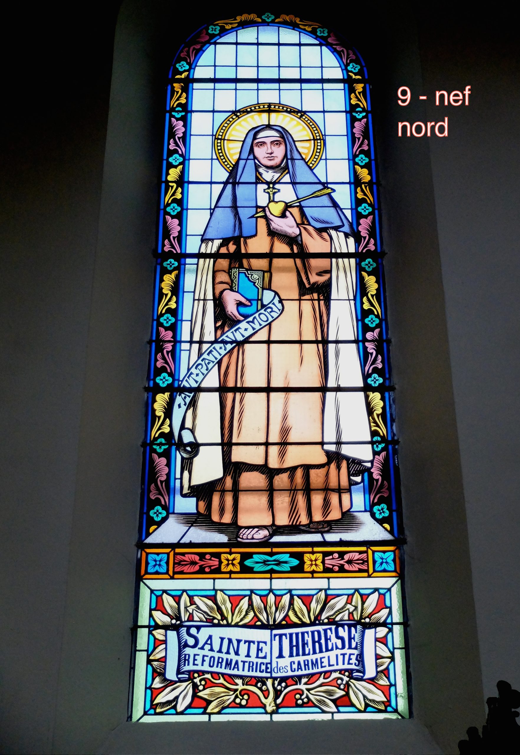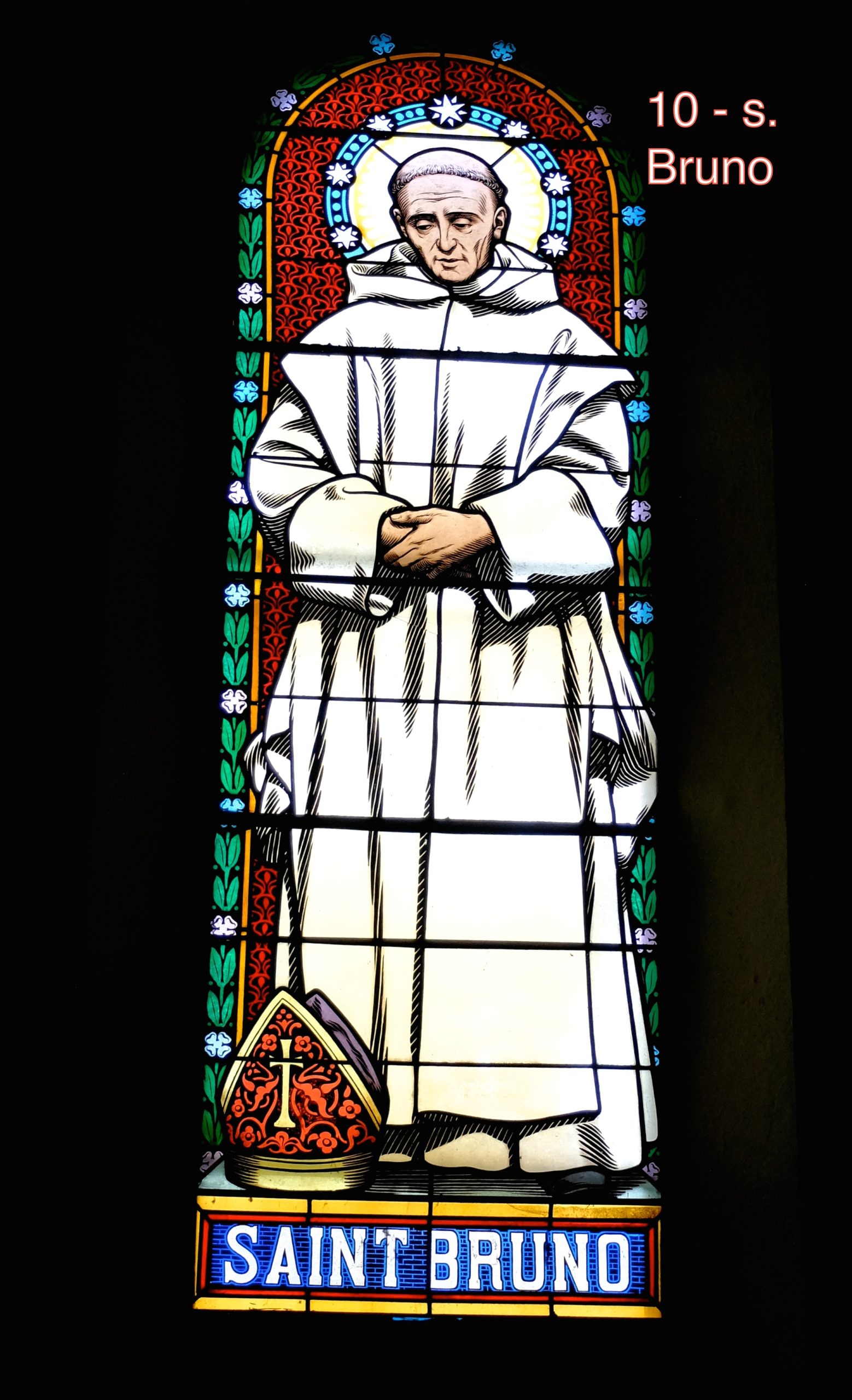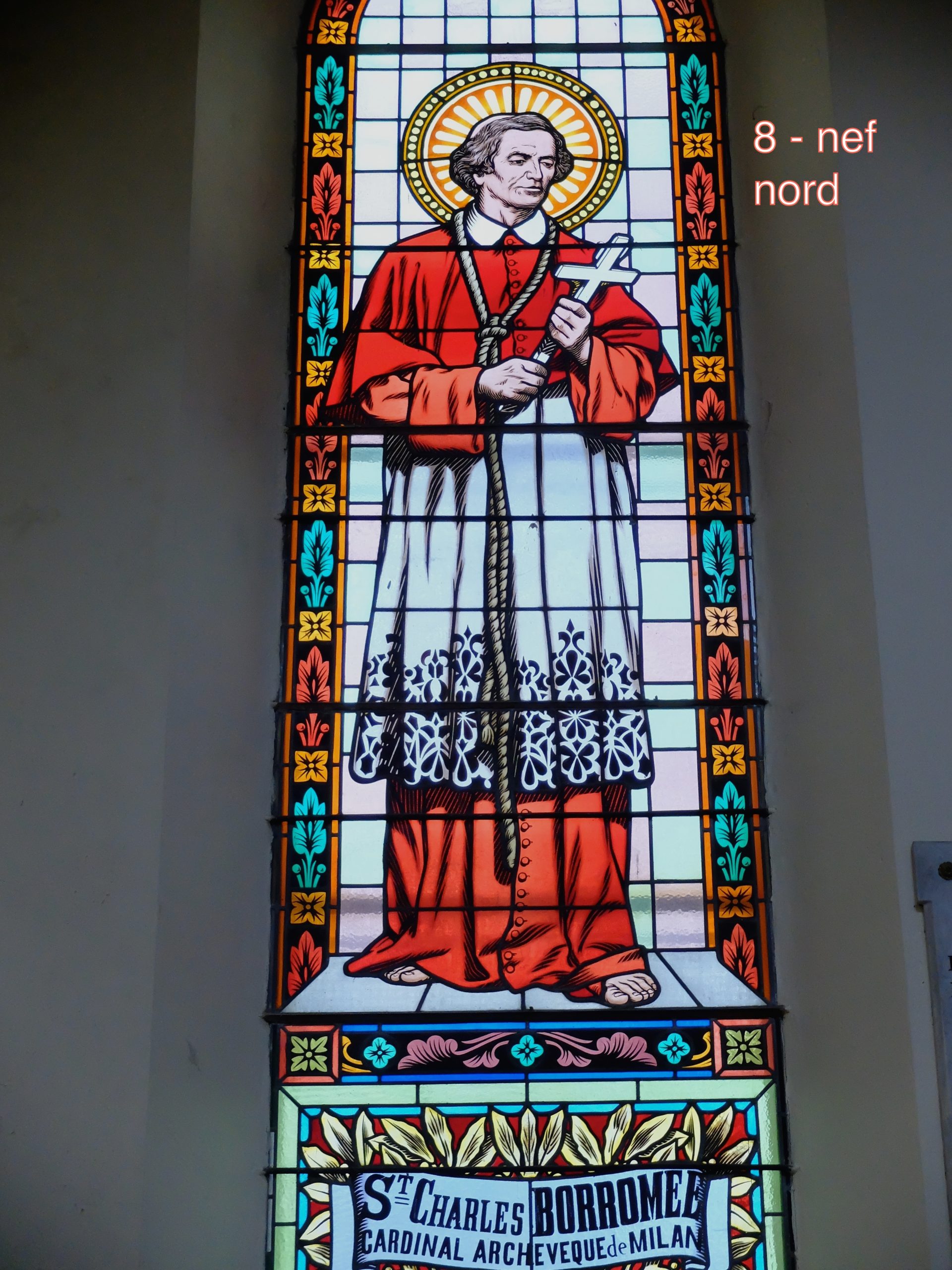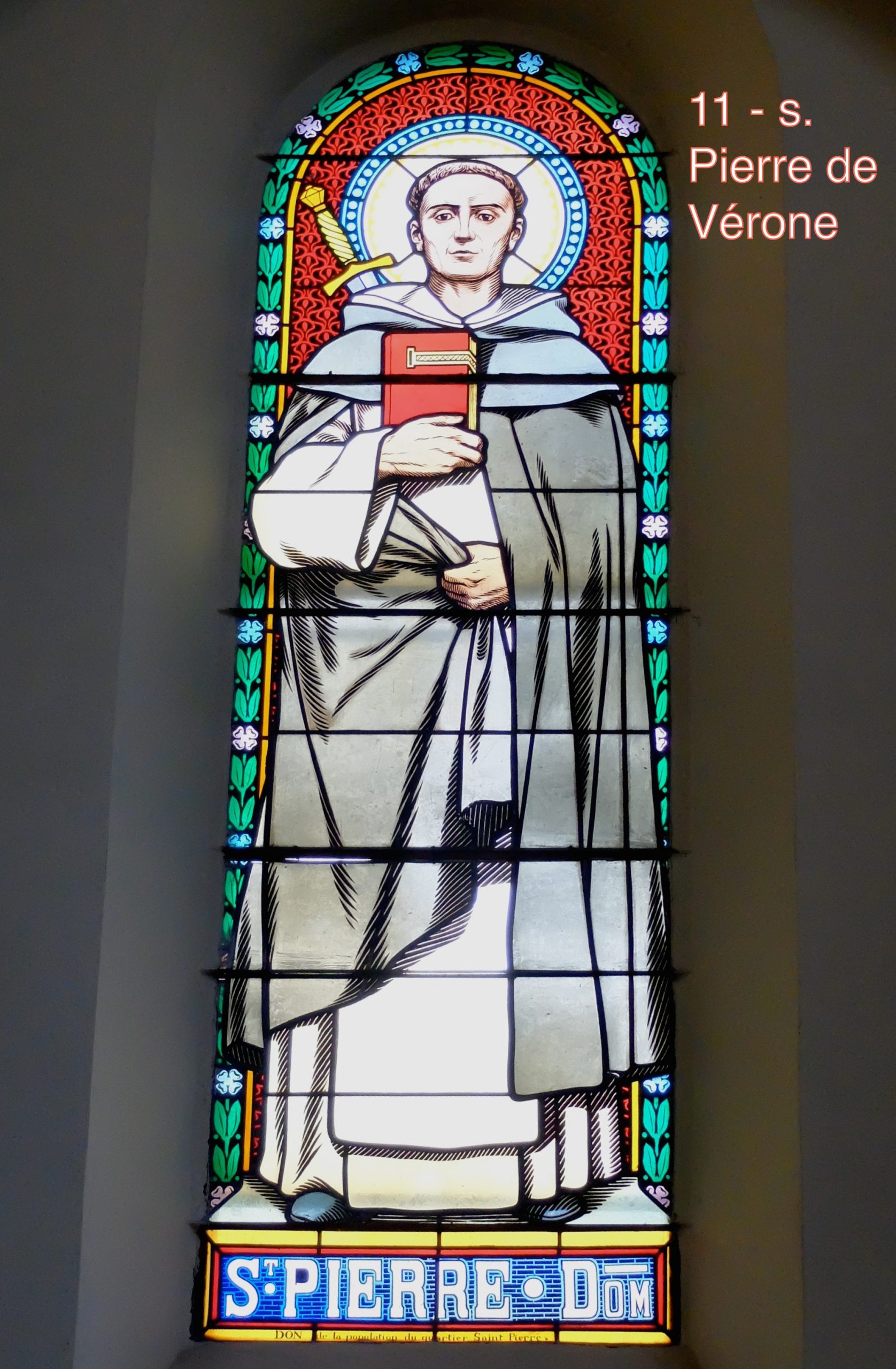 Renage, un village du Dauphiné. On passe devant l’église, elle est ouverte, on entre. Une église néo-médiévale comme il y en a tant d’autres en Dauphiné. Mais ce qui surprend c’est le programme des vitraux. D’abord dans la nef de droite : rien de religieux, chaque vitrail est consacré à un hameau ou un quartier de la commune : maisons, église, place, usines… Les vitraux de l’abside sont consacrés à des saints de sexe masculin. Ceux de la façade ouest, sous la rosace, sont des saintes dont le seul point commun est d’être des femmes (deux reines : saintes Fernande (je n’ai rien trouvé sur elle !) et Mathilde (née vers 896 et morte en 968, elle fut l’épouse d’Henri l’Oiseleur, roi de Germanie et la mère d’Otton Ier, fondateur du Saint-Empire romain germanique), aussi ste Claire, ste Hélène, ste Lucie, ste Elisabeth). Au bout du collatéral gauche, s. Bruno, ce qui n’est pas étonnant si près de la Chartreuse. Mais au bout de l’autre collatéral c’est un saint Pierre avec une épée plantée dans le dos : il s’agit de saint Pierre de Vérone, un dominicain, né à Vérone en 1205, inquisiteur assassiné par ceux qui avaient à craindre de lui en 1252 d’un coup de serpe ou d’épée. Représentation exceptionnelle chez nous : quel intérêt poussait les habitants de Renage ou tout simplement leur curé, à mettre en valeur ce saint qui n’est plus célébré aujourd’hui que dans son ordre ? Quel intérêt local pour ces deux reines que l’on ne célèbre guère ? Dans la nef de gauche, une diversité de saints : des femmes (ste Thérèse d’Avila), un apôtre et le cardinal s. Charles Borromée, peut être parce qu’il fut un artisan de la Contre-réforme et on est dans un pays bien gagné par le protestantisme ?